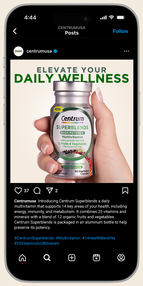 The Centrum brand team was gearing up to launch Centrum Superblends, a new high-potency multivitamin formulated with a unique blend of 25 vitamins and minerals to support overall wellbeing. One of the key factors that they were looking to convey was the product’s recyclable aluminum packaging, designed to best protect product potency.
